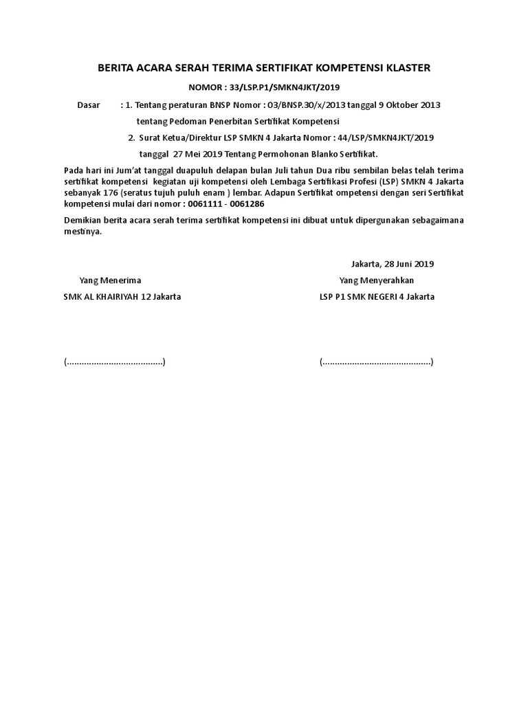 Berita Acara Serah Terima Sertifikat Kompetensi Klaster