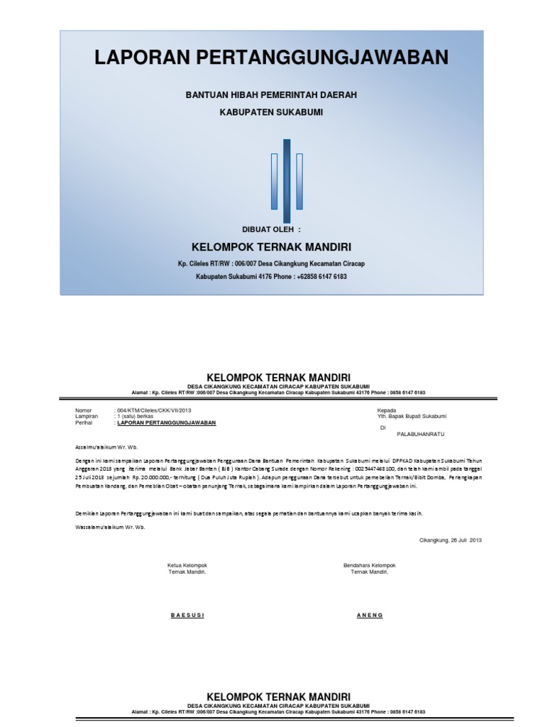 Untuk mendownload contoh proposal pertanggung jawaban Klik Disini yang bersumber dari academiaedu. Demikianlah laporan pertanggung jawaban ini kami buat sebagai wujud tanggung jawab atas kepercayaan seluruh anggota Mapala STIE Muhammadiyah Palopo. LAPORAN PERTANGGUNGJAWABAN REALISASI PENYALURAN DAN PENGGUNAAN DANA HIBAH DAN BANTUAN SOSIAL PEMERINTAH DAERAH KABUPATEN SEMARANG TAHUN ANGGARAN 2017.